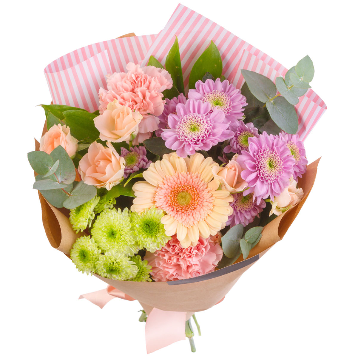 Гербера кремовая, хризантема кустовая зеленая и сиреневая, роза кустовая, гвоздика розовая, эвкалипт. Упаковка (лента, пленка, крафт, сетка, пленка матовая)
