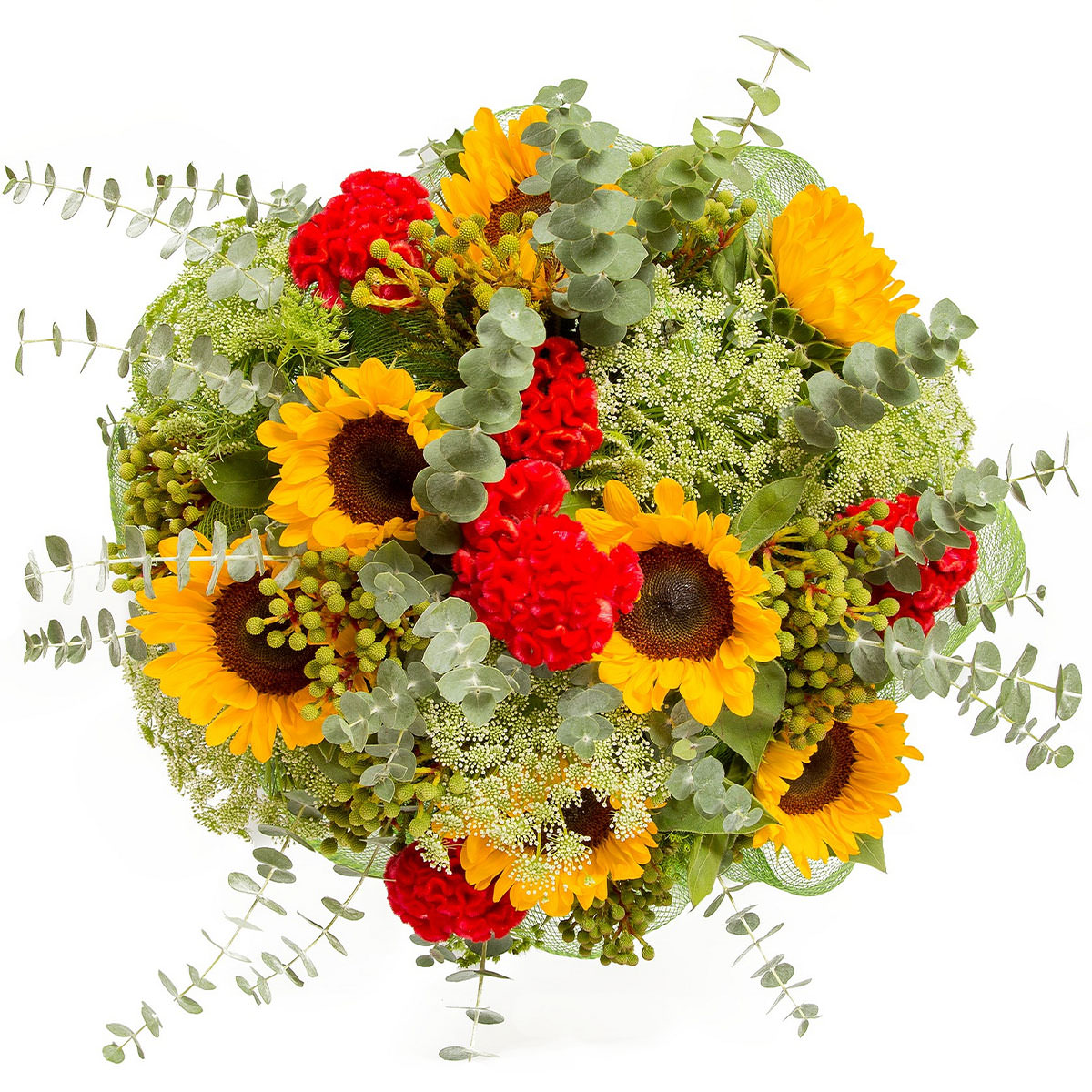 Подсолнух, целозия красная, очиток, эвкалипт. Упаковка (лента, пленка, крафт, сетка, пленка матовая)