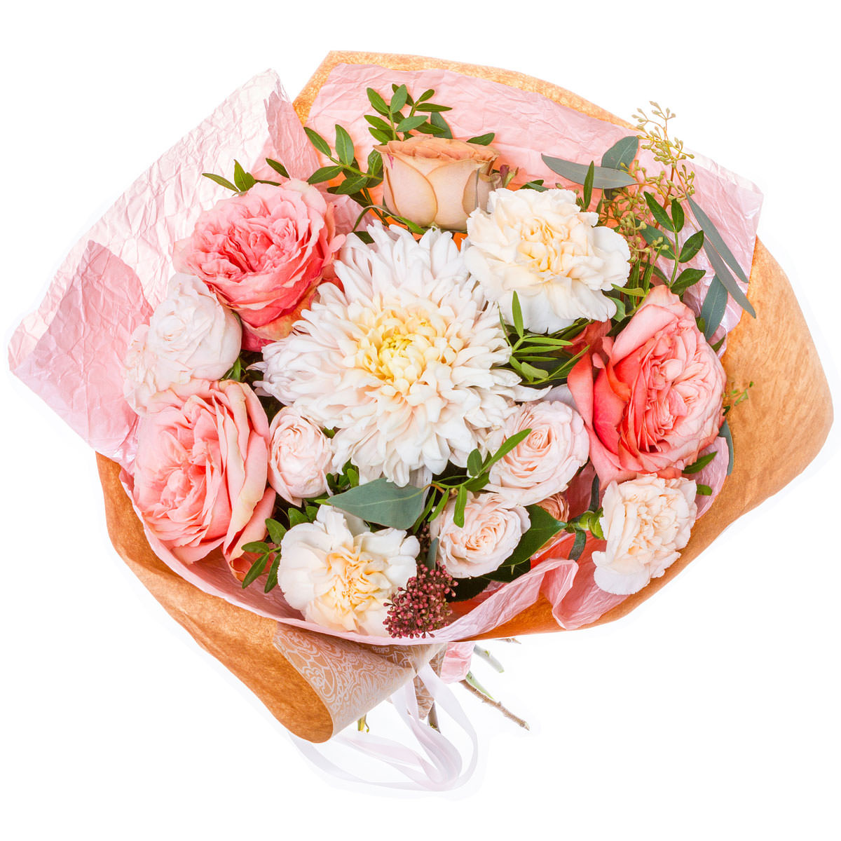 Хризантема одноголовая розовая, роза одноголовая розовая, гвоздика кустовая розовая, озотамнус, фисташка. Упаковка (лента, пленка, крафт, сетка, пленка матовая)