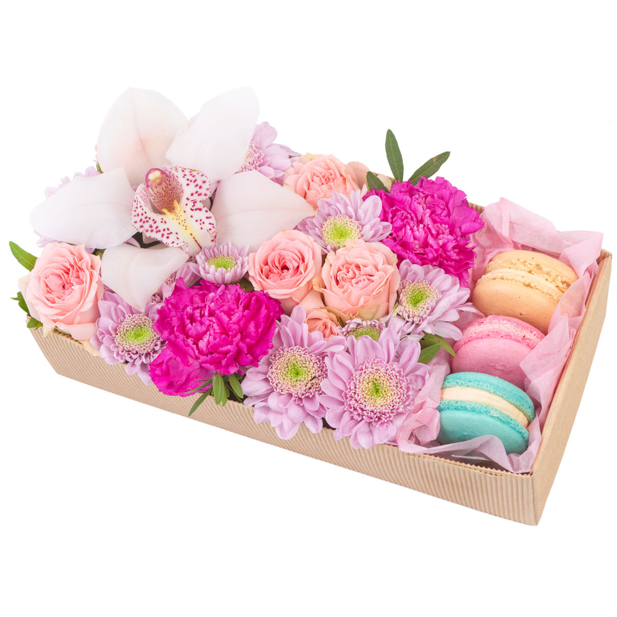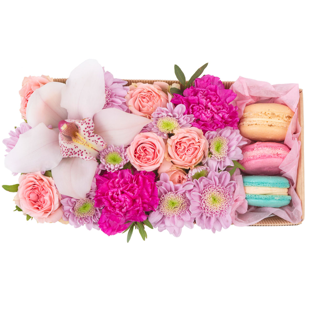 Орхидея белая, роза одноголовая розовая, хризантема кустовая сиреневая, пион розовый, макарон. Упаковка (Корзина, оазис, ящик).